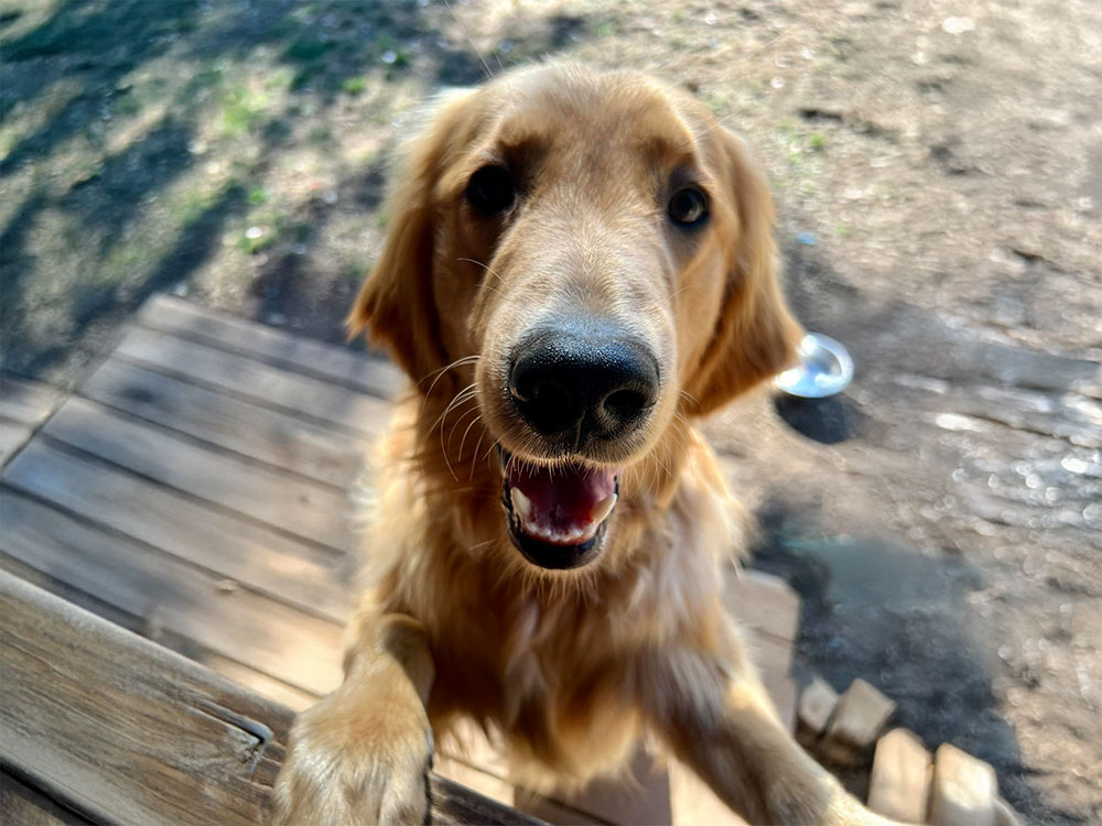 With a coat like spun gold, Hazel is a light-colored golden retriever. She has a radiant personality and a gentle disposition. Her warm, affectionate nature and big smile make her the perfect furry friend for endless adventures and heartwarming moments.